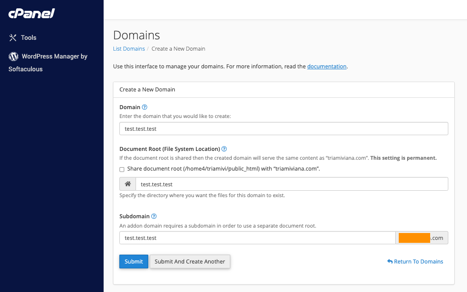 In this section, you will see the first field where you can enter your subdomain only as “north” in “north.example.com.” The second field in this section is called Domain, and this will be the domain name you are setting the subdomains for. The last field is called Document Root, and this is where the files will be located for this subdomain, also known as the document root.